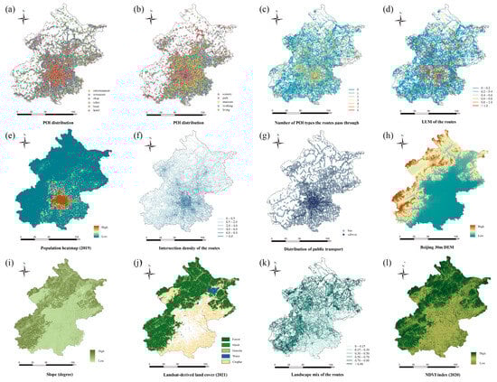 Data distribution of environmental factors: (a,b) depict the distribution of points of interest (POI) points, while (c) presents the number of POI types along each route; (d) represents the LUM index of the route, while (e) displays the population density map of Beijing in 2019; (f) shows the intersection density of each route, while (g) shows the distribution of public transport stations; (h,i) represent the elevation and slope of Beijing, respectively; (j) shows the type of land cover in 2021, and the landscape mix index of each route is shown in (k). Lastly, (l) illustrates the NDVI indicators for Beijing in 2020.