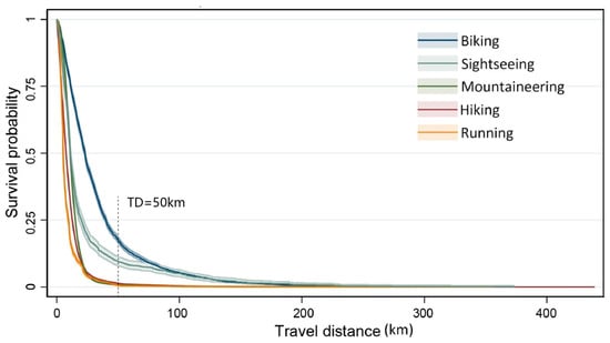 The trip distance is shown on the x axis, whereas the model-predicted survival rate—a measure of the likelihood that leisure travel will occur—is shown on the y axis (Figure 4). Running, mountaineering, and hiking, are the three most responsive forms of transportation, that is, as journey distance increases, the likelihood of continuing declines. Cycling and sightseeing have the highest likelihood of occurring when the distance traveled is greater than 50 km, whereas running, mountaineering, and hiking have a likelihood that is very near 0.