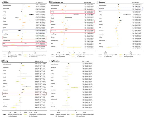 Hazard ratios and 95% CI of two POI indicators (the black refers to the average number of POIs, the yellow refers to the percentage of nonzero sections) for five leisure travel modes, namely, hiking (a), mountaineering (b), running (c), biking (d), and sightseeing (e). The gray and the light yellow, respectively, represent the non-significant factors. The red box marks the percentage of nonzero sections as a positive factor promoting long-distance travel, while the average number of POIs is a negative factor. And the blue box marks the opposite. Note: * means p value is less than 0.05.