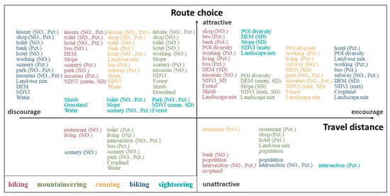 The results of route selection indicate that environmental factors correlate for certain types of leisure travel, whereas travel distance more accurately reflects the amount of physical activity involved in that journey. The findings show some overlap between surroundings that promote physical activity and appealing environments (Figure 6). Routes with high commercial diversity, land functional diversity (for hiking and mountaineering), high landscape mix, unique natural landscape proportions, and topographic diversity, for instance, are related to both leisure travel and are suitable for longer trips. By contrast, routes with low commercial diversity, land diversity (for hiking and mountaineering), and high landscape mix do not.