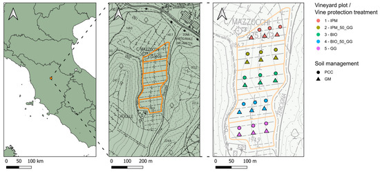 Geographic position and structure of the vineyard located in the “Castello di Gabbiano” farm (43. 6445756, 11. 2582676), subdivision in plots, sampling points and associated vine protection treatments and soil managements applied during the study period 2018–2020. Abbreviations: GM: green manure, PCC: permanent cover crop; IPM: integrated pest management; IPM_50_GG: IPM with 50% of pesticides replaced by Green Grapes elicitors; BIO: organic copper-based plant protection management; BIO_50_GG: BIO with 50% of copper replaced by Green Grapes elicitors; GG: 100% Green Grapes elicitors.