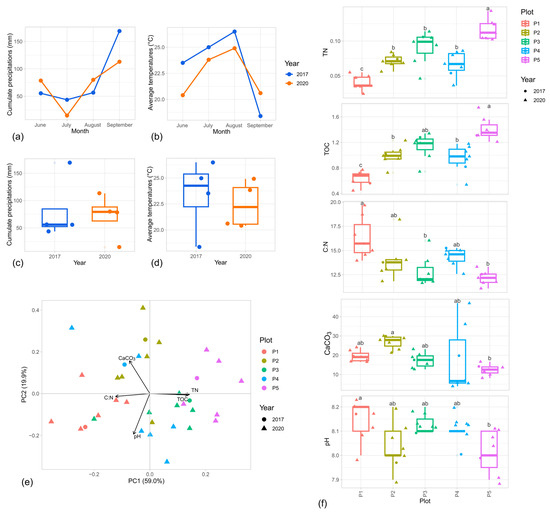 (a–d) Climate data in the summer months of 2017 and 2020. (a,b) Trends of precipitations and temperatures during the months. (c,d) Boxplot reporting values of cumulative precipitations and temperature per year (e,f) Chemical properties of vineyard soils. (e) PCA of the soil samples on the basis of the chemical features. (f) Boxplots of the chemical values separated per plot. Letters notation above the boxplots reports significance of Tukey HSD post hoc test.