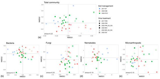 NMDS ordination analyses of (a) the total edaphic community, (b) bacteria, (c) fungi, (d) nematodes and (e) microarthropods retrieved in the vineyard soil samples. Abbreviations: GM: green manure, PCC: permanent cover crop; ST: standard inter-row tillage; IPM: integrated pest management; IPM_50_GG: IPM with 50% of pesticides replaced by Green Grapes elicitors; BIO: organic copper-based plant protection management; BIO_50_GG: BIO with 50% of copper replaced by Green Grapes elicitors; GG: 100% Green Grapes elicitors.