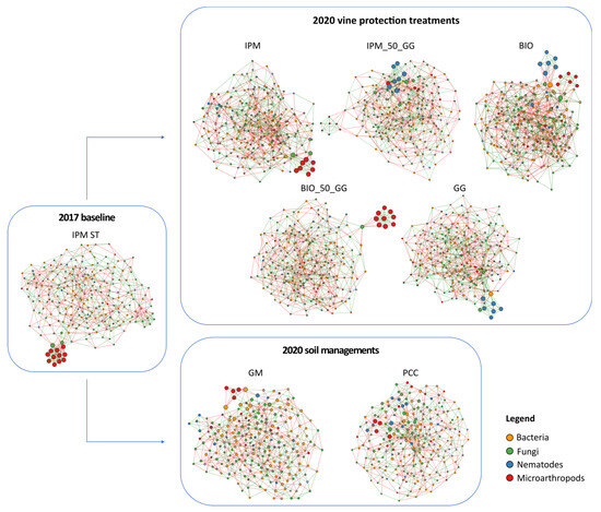 Concerning the network conformation (Figure 4), it was observed that the baseline network (2017; IPM) and all those obtained by grouping samples on the basis of vine treatment (2020; IPM, IPM_50_GG, BIO, BIO_50_GG, GG) had an overall similar structure, showing a set of taxa (often represented by microarthropods and/or nematodes, red or blue nodes) clearly separated from the rest of the nodes.