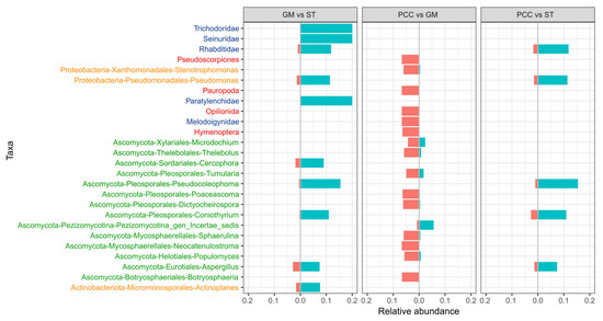 Finally, SIMPER analysis was performed to better investigate those taxa that mostly distinguish the communities associated with the three soil management (Figure 5). PCC and GM behaved similarly towards ST. Specifically, most of the taxa identified by SIMPER to distinguish between managements showed a higher relative abundance in ST; some of those (n = 5) were common to the comparisons PCC-ST and GM-ST, while others (n = 6) were retrieved only in the GM-ST comparison. Specifically, the nematode families of Trichodoridae (virus-vector), Paratylenchidae (plant-parasites) and Seinuridae (predators) were more abundant in ST than GM. In addition, the family Rhabditidae, belonging to nematode bacterial feeders and classified as colonizers, decreased its abundance both in GM and PCC. The pairwise comparison between PCC and GM highlighted, for the taxa that best discriminate among these two groups, higher abundances for PCC samples than GM ones, with the exception of an Ascomycota member. Only a few bacteria were retrieved in this analysis, belonging to Proteobacteria and Actinobacteriota. On the other hand, many Ascomycota members were identified, able to distinguish both the GM/PCC-ST pairs and the PCC-GM one. Nematodes and microarthropods also contributed to discriminating these two groups. In particular, GM reduced the abundance of the Meloidogynidae family (one of the most harmful plant-parasitic nematode family) and the microarthropod orders of Pseudoscorpiones, Pauropoda, Opilionids and Hymenoptera.