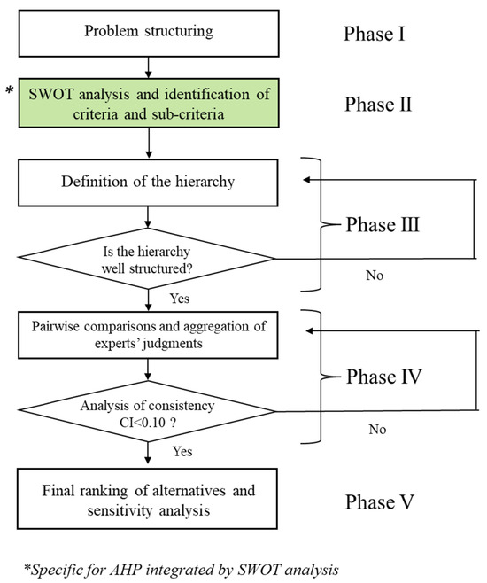 The integration of the AHP within a SWOT framework aims to assess, systematically, SWOT categories and factors and render them comparable in terms of their relative importance [40]. The SWOT framework establishes the fundamental structure for analyzing a decision-making scenario, while the AHP supplements the SWOT analysis with a robust analytical decision-making tool [41]. Through the assessment of SWOT categories and factors, it becomes possible to discern, for instance, whether particular weaknesses demand primary attention or threats may surpass future cumulative opportunities [41,42,43].