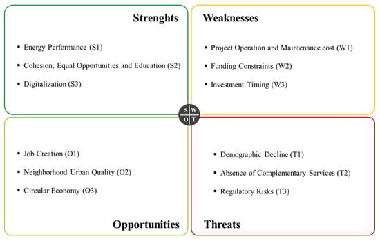 As outlined previously, the evaluation process is articulated into five stages. The initial stage involves the implementation of the SWOT analysis and the construction of the SWOT matrix to delineate the decision problem. Specifically, SWOT categories were disaggregated into distinct factors, representing pivotal facets for the evaluation of urban development projects. To ascertain these SWOT factors, we conducted an extensive literature review on the main drivers of urban development projects and urban quality [15,45]. Additionally, we identified and interviewed a panel of experts comprising local authorities, academics, and technical stakeholders engaged in redevelopment projects. Figure 2 details the SWOT factors identified: