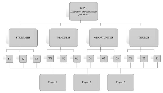 On the other hand, SWOT analysis is based on internal and external evaluation criteria, also defined as SWOT categories, and offers a comprehensive assessment of SWOT categories: namely, internal Strengths and Weaknesses, which can contribute to achieving objectives, and external Opportunities and Threats, which can prevent objectives from being achieved [36,37,38]. SWOT analysis is extensively utilized as a tool for analyzing both internal and external environments, providing a systematic approach to support strategic decision-making in various contexts. SWOT analysis excels in identifying key factors for analysis to support the decision-making. However, it primarily provides qualitative assessments [39]. To rectify this limitation and enhance the quantitative foundation of strategic planning processes, the A’WOT method has been proposed in the early XXI [40]. A’WOT is a hybrid approach that integrates SWOT analysis with the Analytic Hierarchy Process.