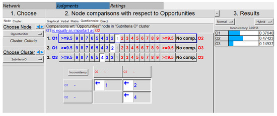 Example of pairwise-comparison questions for the evaluation of sub-criteria O1, O2, and O3 with respect to criterion “Opportunities”. Source: SuperDecision Software V-3.2.