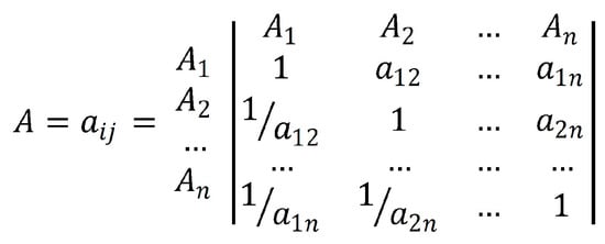 Pairwise comparisons are used to fill pairwise-comparison matrices of rank n (1), namely square matrices of preferences, in which the dominance coefficient represents the relative importance of the element on row i against the element on column j [34,46]. To clarify, the value of corresponds to the relative importance of a specific criterion, sub-criterion, or action when compared to another criterion, sub-criterion, or action . A score of 1 denotes equal importance between the two components, while a score of 9 indicates the extreme importance of component i over component j. Pairwise comparison matrices take the form of square n × n positive reciprocal matrices of preferences (Figure 5). The comparisons along the main diagonal are set to 1 due to the reflexive nature of the binary preference relation, while the elements within the lower part of the sub-matrix are reciprocals of the elements within the upper triangle (i.e., :