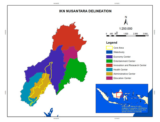 IKN Nusantara is situated in the East Kalimantan province. The site is divided into several areas. As seen in Figure 1, this area is divided into several zones with different functions, including core areas, economic areas, entertainment centers, research and education centers, and administrative centers.