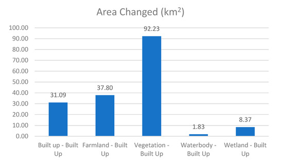 The most substantial change observed is the conversion of vegetation to built-up, amounting to 92.23 km2. This represents a substantial land conservation with vegetation cover to developed land use, which can be associated with deforestation for urban or industrial development. This transition has profound ecological consequences, including reducing ecosystem services, carbon stock, and wildlife habitat. The change from ‘waterbody’ to built-up is minimal, covering only 1.83 km2. Despite its small scale, this change raises concerns regarding water resource extinction and management, considering that converting water bodies to developed land could affect the quality and quantity of available water resources. Lastly, the transition from ‘wetland’ to built-up, covering 8.37 km2, is also noteworthy. Wetlands are crucial ecosystems, providing essential ecological functions such as flood mitigation, pollutant filtration, and biodiversity maintenance. This conversion may indicate developmental pressure on wetlands and raise concerns over the loss of ecological functions they provide.