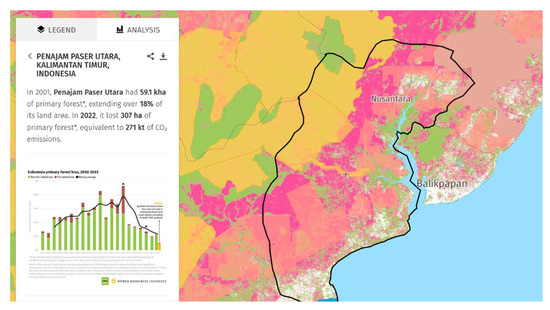 Primary forest cover is lost in Penajam Paser Utara, East Kalimantan, Indonesia. Between 2001 and 2022, the region experienced a drastic reduction of primary forest from 591,000 hectares—over 98% of its land area—to just 103,000 hectares. This represents a stark decrease in forest area and translates into substantial CO2 emissions, amounting to 27,000 kT, as forests act as carbon sinks. Figure 5 (https://www.globalforestwatch.org accessed on 24 February 2024) details the year-on-year decline of primary forests in Indonesia, highlighting a continuous trend that has substantial implications for biodiversity, climate change mitigation, and the livelihoods of local communities dependent on forest ecosystems.