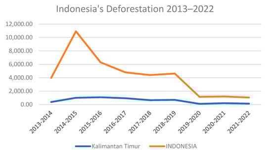 Recent data on deforestation in Indonesia, with a particular emphasis on East Kalimantan and the national total from 2013 to 2022 (Figure 6), reveals informative trends relevant to conservation efforts and natural resource management within the country. East Kalimantan, a province renowned for its extensive tropical rainforests, has experienced fluctuations in deforestation rates over the past decade. In 2013–2014, deforestation in this province was recorded at 383.394 km2, significantly increasing to 1009.308 km2 in 2014–2015, and peaking in 2015–2016 at 1086.82 km2. Following this increase, a downward trend in deforestation was observed in East Kalimantan, with deforestation rates decreasing to 949.818 km2 in 2016–2017 and continuing to decline to 137.588 km2 in 2021–2022. This decline may reflect the impact of forest conservation policy implementation, enhanced environmental protection efforts, and growing awareness of the importance of forest maintenance for ecological and social sustainability. On a national scale, Indonesia exhibited a similar pattern, with total deforestation reaching its zenith in 2014–2015 at 21,843.630 km2 before decreasing. National deforestation figures have gradually reduced year after year, indicating progress in forest management and conservation efforts across Indonesia. The reduction in deforestation in East Kalimantan and nationally signifies a positive step towards more sustainable natural resource management. Nevertheless, it still requires the sustained commitment of all stakeholders to maintain this positive trend [44].