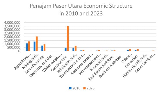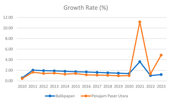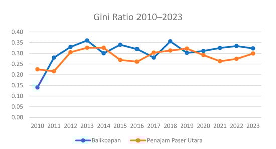 The development of the new capital area, located near Balikpapan and Penajam Paser Utara (PPU), is anticipated to catalyze local economic expansion. However, challenges and socio-economic dynamics may arise as consequences. In Balikpapan, rapid advancements in manufacturing, as evidenced by its increasing contribution to the GRDP (Figure 10), promise employment and investment opportunities. Nevertheless, potential conflicts could emerge if economic growth results are not equitably distributed and this sector monopolizes local resources and labor. The inequality indicated by the Gini ratio might worsen due to the direct impact of economic and population structure changes with the capital’s development. Conversely, PPU’s progress in agriculture and construction supports the capital’s economic advancement (Figure 11). However, there is a necessity for management strategies to ensure that such progress does not lead to further inequalities or competition over resources. This growth must be carefully guided to support the capital’s agenda without overburdening local communities and ecosystems, achieving the desired economic growth without compromising social or environmental stability.