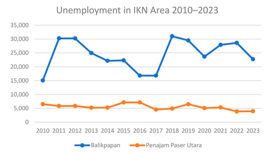Since the designation of Nusantara as Indonesia’s new capital city, there has been a significant migration phenomenon (Figure 8) to the surrounding areas, particularly North Penajam Paser and Balikpapan [75]. This migration flow reflects a demographic transition driven by various factors, including improved economic prospects, increased employment opportunities, and infrastructure development associated with the construction of the new capital. The populations in both areas have shown substantial increases, with Balikpapan experiencing an addition of 146,032 individuals and North Penajam Paser increasing by 48,975. The significant migration to areas around Nusantara, especially North Penajam Paser and Balikpapan, has profound implications for the socio-cultural dynamics of these areas. The rapid influx of a large population can pressure local resources, which often need to be prepared for the new wave of inhabitants. Such tension may arise from competition for jobs, land, housing, and limited access to public services. Indigenous populations may feel displaced due to rapid changes in their living areas’ economic and social structures.