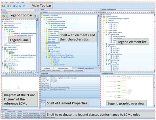 LCCS3 comprises seven screen areas, as shown in Figure 3, sometimes with overlapping functionalities and the disadvantage that they are shown in a very tight area, severely limiting the readability and usability. For example, users must zoom in to understand the abiotic element and connected entities, making it cumbersome. The information displayed in the figure remains static and continuously takes up valuable screen space. The “shelf to evaluate the legend classes conformance to LCML rules” displays warning and error messages, which should be shown on demand, especially if there are no issues to report.