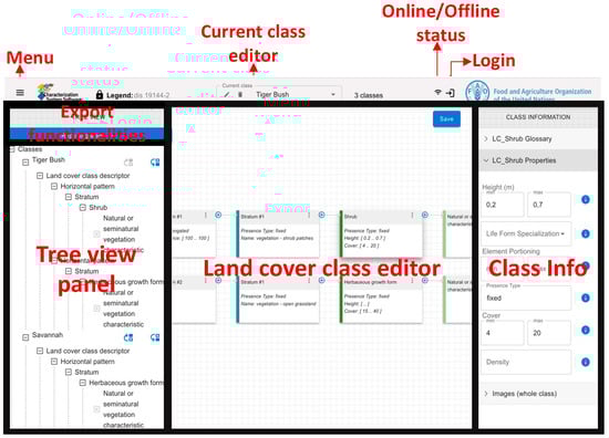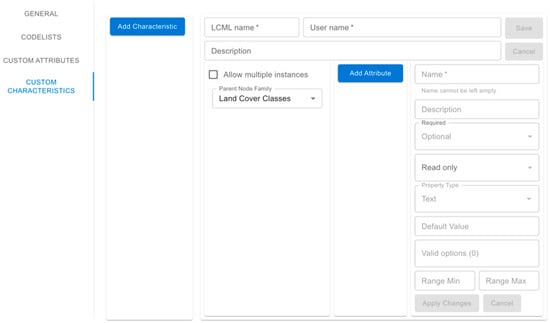With the advent of the ISO 19144-2 standard (LCML) in 2012 and its revision2 in 2023 [9], the representation of LC classes is possible through UML-like models, basically tree-like structures with connected nodes (mainly corresponding to essential elements and characteristics). The hierarchy of the nodes becomes vital to the definition of the classes. Due to this, a specific editor was needed, and the LCCS3 tool was developed as an application running on the Windows OS [10,11].