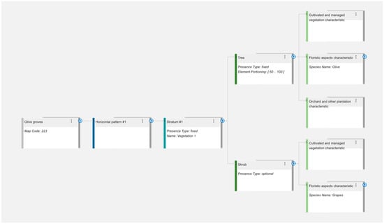 It is noted that in the same area, other vines, fruit trees, or other crops can be present; provided that more than 50% of the area is occupied by olives, we can still consider it an “olive grove”. LCML does not provide a fixed number of classes, nor predefined classes. Instead, it provides building blocks, mostly in the form of physiognomic basic elements, such as “trees”, “shrubs”, and “herbs”, along with other kind of blocks, representing additional information. This way, an unlimited number of classes can be obtained. Additional properties and characteristics per block can also be added as required. Considering the setup, the representation of olive groves in LCML can be directly derived from interpreting the guidelines in Table 3.