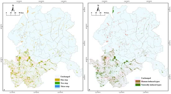 Because the area of the 3-step transformation region in the land-use trajectory is small, in terms of spatial distribution, 1-step transformation mainly occurs in the region of carbon stock increase, and 2-step transformation dominates in the region of carbon stock decrease (Figure 6 and Figure 7). In the human-induced type, carbon stock mainly increases, while in the natural-induced type, carbon stock increases and decreases are interspersed, and the area of carbon stock decreases is large and dispersed.