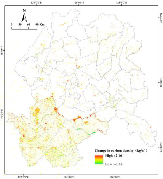 The results of this study showed that the overall soil organic carbon stock in the Songnen Plain showed a decreasing trend in the past 15 years, with an overall decrease of 1.63 × 105 t, but it still accounted for more than two-thirds of the terrestrial carbon stock in the Songnen Plain, which is consistent with the results of previous studies [39,46]. The range of vegetation biocarbon stock was 1.96 × 108 to 2.25 × 108 t, with an increase of 2.08 × 107 t in stock, which measured similarly to the results of previous studies [17,24]. It is worth noting that the overall vegetation biocarbon density was significantly lower than the soil organic carbon density, reflecting that the soil carbon pool in the Songnen Plain possessed a higher carbon density, corroborating Li et al. (2007) and Yang et al. (2007), who measured that Northeast China possessed a higher soil organic carbon density [47,48].