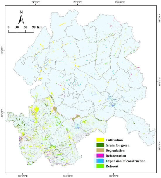 Spatial distribution of cultivation, grain for green, degradation, deforestation, the expansion of construction, and reforestation in the Songnen Plain, 2005–2010.