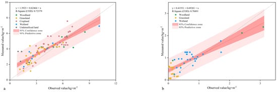 Comparison of the measured and observed soil organic carbon density (a) and vegetation biocarbon density (b) in the Songnen Plain.