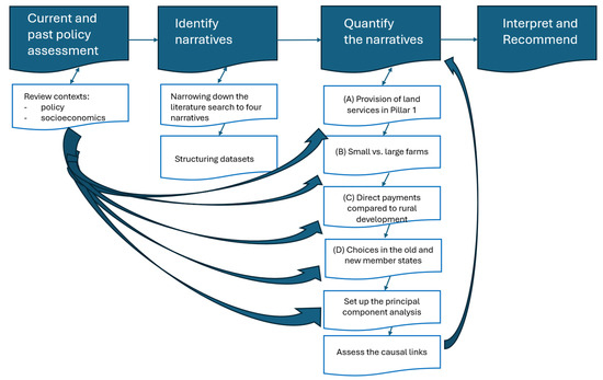 Furthermore, the research employed, as a partial method, Principal Component Analysis, PCA. The principal components used included one set of variables in direct payments per hectare, which were assumed to be normally distributed. This derived variable was created as a linear combination of the original variables to explain the greatest variance []. The other principal component, in terms of average farm area per member state, then explains the largest variance in what remains after removing the effect of the first component. The PCA was used because the variables in the support set were highly correlated with each other, and it is useful to reduce their characteristics to an independent set. The overall interpretation method is illustrated in Figure 1. It used descriptive statistics and Principal Component Analysis (PCA) to quantify the main narratives related to land services associated with the land use economics of the Common Agricultural Policy (CAP). This method relied on quantitative storytelling, as described by Saltelli et al. []. In doing so, it helped us consolidate EU-level data without relying solely on a case study approach, which has been the norm in new member states (please see Ref. [] for the Czech Republic and Ref. [] for Slovenia).