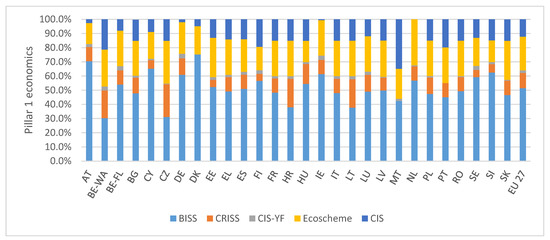 Position of eco-schemes within Pillar 1 payments. Note: BISS, Basic Income Support for Sustainability; CRISS, redistribution income support; CIS-YF, young farmer payment; CIS, voluntary coupled support.