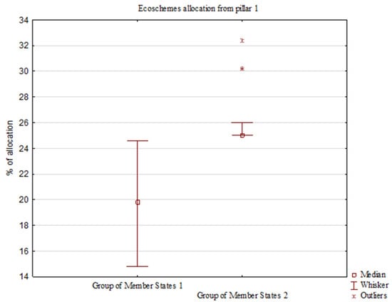 One of the main components of payment for ecosystem services is the eco-scheme within Pillar 1 (i.e., within supports that go directly to farm economics). The allocation of the Pillar 1 budget to eco-schemes determines the provision of land services. Some countries, such as Austria, Finland, Hungary, and Slovenia, allocate only around one–sixth of the Pillar 1 budget to eco-schemes (Figure 2). However, 13 member states focus on eco-schemes by allocating around 25% of the Pillar 1 budget (Figure 3). Table 1 captures the descriptive statistics of the figure. The member states who prioritize the economics of eco-schemes as the key payment for land services (the Czech Republic and the Netherlands) allocate 30% or 32% to eco-schemes. After analyzing how the choices are implemented by the old and new member states, we found that these categories establish fairly identical groupings when it comes to the share of the budget allocated to Pillar 1. This means that it is difficult to associate the pro-eco-schemes member states and the minimum-eco-schemes member states with the historical adherence to the EU and the old and new labels. To better understand why some member states allocate more funds to land services through eco-schemes than others, a more detailed study is required. This study should investigate various factors such as agronomical conditions, biophysical and bioclimatic factors, and socioeconomic aspects.