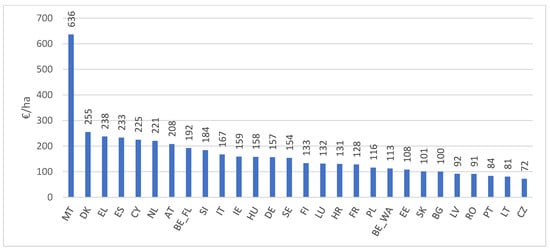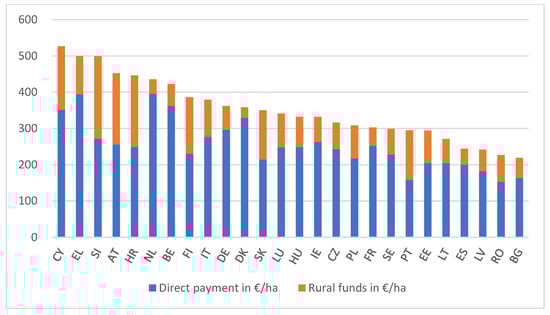 Rural development is a program within the CAP Strategic Plans. It supports farm modernization through capital investments and land-based payments. It provides significant help with environmental aspects of land use through agri-environment management. Although rural development always receives a smaller share of funds than Pillar 1 economics, some countries put great emphasis on it (Figure 8). In the past, the new member states used to align themselves with Pillar 2 rural development. This was because, during the socialist era, the government of Czechoslovakia (which included today’s Czech Republic) mainly implemented scant regulatory measures in land use. Weak environmental policies were the norm during this time, due to a lack of enforcement []. In the early 1990s, strong citizen support for regulating negative effects to land services came to the forefront. At the same time, the Czech government had almost no experience in designing and implementing environmental policies in close collaboration with stakeholders [].