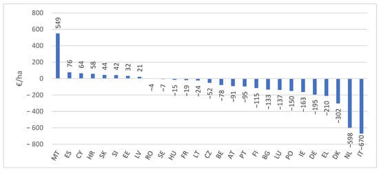 It is worth noting that land use is partly driven by direct income support. Figure 4 displays the direct payment per hectare in each country. In our interpretation of this criterion, we excluded the outlier value and established that there is a significant level of consistency among the EU member states. Two equally sized groups of countries scored slightly above average and slightly below average. However, this analysis has its limitations, and it would be helpful to adopt a case study approach to gain a better understanding of whether higher hectare payments indicate a greater risk of adverse effects on the environment. From the perspective of the new member states, two countries (in addition to Malta) fall into the category of higher-achieving countries, while nine countries fall into the category of lower-achieving countries. In Figure 5, there is a complication that affects the direct payments made by each country. The payments are reduced by deducting land rental fees. This means that the interpretation of the winners and losers will be different from the preceding criterion. When considering the rental fees for land across Europe, five new member states have positive farm income, whereas seven of them have negative farm income. Furthermore, as we show in the next section, farmers receive redistributive payment (CRISS) according to a certain threshold of hectares, e.g., up to 150 hectares in the Czech Republic, which is the dominant number of agricultural holdings in the country. Thus, the incentive from Pillar 1 economics is the aggregate of these components of support, and, for instance, for the aggregate of BISS and CRISS, the Czech Republic has the largest support per hectare in the Central European Region.