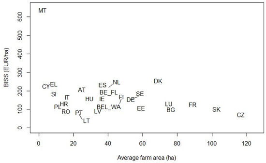 Several countries have an average farm area larger than 75 hectares: France, Slovakia, Luxembourg, Bulgaria, and the Czech Republic. Out of these five, the farm structures in the Czech Republic and Slovakia have an average size of over 100 hectares. However, the farm area is decreasing in these countries as well. The countries with large farms have relatively high allocations of BISS direct payments per average farm. On the other hand, there are 11 member states whose farm area is smaller than 25 hectares, and four with an average farm less than 10 hectares. Table 2 shows that BISS direct payment is about three times larger in countries with an average farm of less than 10 hectares. This overall comparison hides the differences between member states with large and small farms when it comes to the average farm income. When comparing the income per farm, among the countries with average farms smaller than 25 hectares, only Austria has a relatively high BISS support per average farm (5172 €/ha).