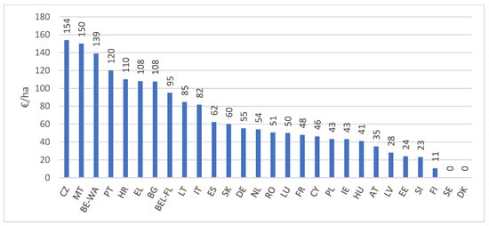 The economics of land services has been explained in general [] and further elaborated for agriculture [,,,,,,,]. As a recognized think piece, it is an important part of Pillar 1 economics. The extent of land services linked with Pilar 1 economics are affected by a combination of biophysical and agronomic factors, such as the primary land use and the proportion of semi-natural habitats that serve as a crucial resource for land services, as well as socioeconomic factors that relate to the level of poverty or wealth in the region. These factors have been outlined in Appendix A Table A1 for five different countries. Until recently, Pillar 1 policies could not thus establish causal relationships between interventions and outcomes, which is essential for policymakers []. This has changed with the onset of eco-schemes in 2023, aiming to improve the shortcomings of greening policies introduced in 2014 in the CAP []. Eco-schemes are a new feature in Pillar 1, while the agri-environment remains the only mandatory measure in Pillar 2. Member states vary in the importance they attach to eco-schemes, although a large majority dedicate around 25% of the Pillar 1 budget to them. However, to understand whether and to what extent these measures are delivering land services and biodiversity benefits on the ground, it is important to know that they work differently than Pillar 2 agri-environmental schemes. Eco-schemes are voluntary, though potentially they are measures that have a universal character, applying to all farmers across the EU-27, similarly to Pillar 1 direct payments. The variability of eco-schemes in technical design will be the main difficulty in assessing their effectiveness in 2027 when the CAP Strategic Plans expire. In addition to eco-schemes that focus on biodiversity, soil, water, and climate issues under land services, Pillar 1 economics dedicates enormous resources to incentivizing the food provisioning service through Pillar 1 direct payments (BISS). There are also several other payment components for young farmers and sensitive production sectors. However, it is not easy to compare BISS per hectare among and between member states because other factors, such as rental fees for land, also play a role in the magnitude of the incentive offered to a farm from the public budget. For example, the outlays for BISS in the member states show that the Czech Republic has the lowest absolute BISS in EUR per hectare. But after the deduction of the rental fee for land, the country is in the middle of the scale of the size of adjusted BISS. According to broader policy studies [,], eco-schemes are the most radical change in Pillar 1 land use economics, similar to our research findings. Researchers in Ref. [] provide more detailed information on the specific land services supported by eco-schemes, stating that member states prefer to support climate change mitigation and soil protection. With regard to redistributive payment, our research found a wide variety of approaches, while Ref. [] researchers further discovered that the allocation to redistributive payments has significantly increased compared to the previous programming period.