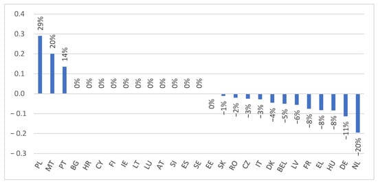 Currently, the countries that put emphasis on rural development are Cyprus, Slovenia, Austria, Croatia, Finland, Slovakia, and Poland. It is worth noting that except for Slovakia, these countries have small average farms, as shown in the previous section. Therefore, it is possible to conclude that rural development economics is stronger in these member states to enable more support categories for small farms. Another criterion for the focus on rural development is national co-financing. In this perspective, the Czech Republic applies the fifth highest national co-financing for rural development, with 63% (103 €/ha), compared to 40% (Poland), 51% (Austria), 34% (Germany), 37% (Slovakia), 80% (Hungary), and 34% (France). Finally, one should also consider the country’s strategy in strengthening one or the other pillar by voluntary transfers (so-called modulation). The Netherlands is the leader in strengthening rural development economics by 20% at the expense of Pillar 1. On the other hand, Poland has an opposite strategy in reducing rural development economics by 29% in favour of the Pillar 1 economics (Figure 9).