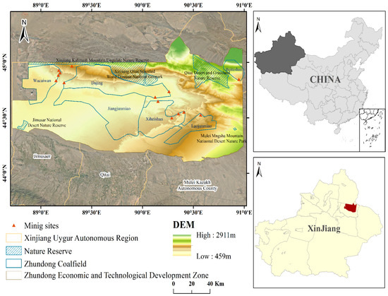 The area of study is situated in an ecologically sensitive region, comprising mostly desert areas with hot and arid climatic conditions. The average diurnal temperature difference is 6.5 °C. The highest annual temperature occurs in July–August, often reaching above 40 °C, and the lowest temperature occurs in January, often reaching below −30 °C. The freezing period is from December to February, and the total annual hours of sunshine is 2800–3100 h [49]. Precipitation is concentrated in June and July, with an average annual rainfall of 106 mm. In the study area, there is no continuous surface runoff. Only during the snowmelt season or after heavy summer rainfall may temporary surface water flow occur in the gullies. The number of annual days of rainfall generally does not exceed 15 [50]. The degree of desertification is severe, and the area is classified as being moderately sensitive to land desertification and is a critical protection zone for soil erosion prevention in Xinjiang. Moreover, three established nature reserves—Kalamaili Mountain Ungulate Nature Reserve, Qitai Desert Grassland Nature Reserve, and Xinjiang Qitai Silicified Wood Dinosaur National Geological Park—are situated near Zhundong. Prior to mine construction, there were no permanent residents in the area; however, following the construction of mines, the majority of residents now consist of mine workers and their families. The economy of the study area is mainly based on animal husbandry, exhibiting the minimal presence of farming practices [50].