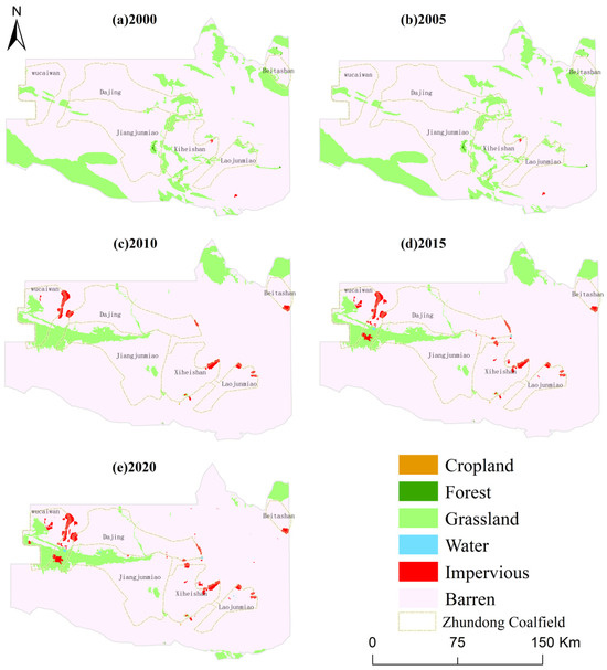 - The main LULC types in the Zhundong coalfield from 2000 to 2020 were grassland and barren areas. The LULC pattern changed significantly in 2010 after the national government and the autonomous region started to exploit the Zhundong coalfield in 2006. The impervious area in the study area is mainly distributed near the mines, mainly for industrial and mining purposes or for residential purposes for mine workers and their families; the cropland in the study area occupies a minimal area, mainly around the Jijihu area.