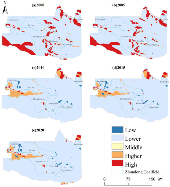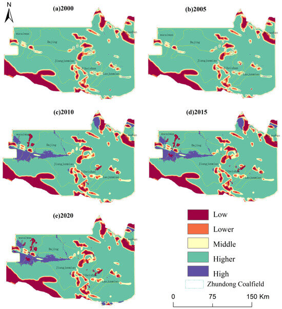 In this study, the degradation degree of HQ in Zhundong was assessed using the HQ module of the InVEST model for the years 2000, 2005, 2010, 2015, and 2020 (refer to Figure 5). The mean values of its HQ degradation index were 0.219, 0.219, 0.160, 0.159, and 0.149, respectively, indicating a general decreasing trend. As shown in Figure 3, the spatial distribution of the HQ degradation degree in the study area did not change much from 2000 to 2005. A large area of unused land, along with virgin forest and grassland, had low degradation degree values. The southwestern and central parts of the study area gradually transformed into areas with a high degree of degradation of the original HQ. In 2015, scattered areas with low or lower levels of degradation were observed in the northwestern and central parts of the study area. By 2020, the areas with low levels of degradation of HQ had increased in the northern part of the study area, shifting it from having high HQ degradation to having relatively high or moderate HQ degradation. Meanwhile, the southern region shifted from having moderate to high degradation. Additionally, areas with a low or lower degradation degree of HQ appeared around Wucaiwan and Jiangjunmiao and the Xiheishan Mountain mining area.