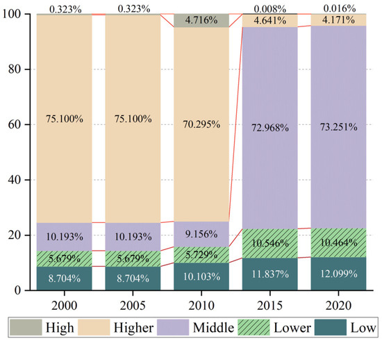 As shown in Figure 3 and Figure 4, this study calculated and analyzed the percentage stacked graph of habitat quality (HQ) in the Zhundong area and the spatiotemporal distribution pattern of HQ in the study area from 2000 to 2020. The HQ was classified into five levels: low, lower, medium, higher, and high, using the natural break method to indicate the strength levels. From 2000 to 2010, the HQ was relatively high, with the proportion of high-value areas accounting for 75.100%, 75.100%, and 70.925%, respectively, mainly represented by vast virgin forest and grassland areas within the region. However, from 2010 to 2020, the increase in mining activities in the Zhundong coalfield area led to a decline in HQ around the Wucaiwan mining area, Dajing mining area, and Jiangjunmiao mining area. The proportion of low-value habitat areas in the study area from 2000 to 2020 was 8.704%, 8.704%, 10.103%, 11.837%, and 12.099%, respectively. Overall, the proportion of high-value and higher-value habitat areas in the study area decreased over the two decades. The extensive mining and excavation activities in the Zhundong area have severely impacted the local ecosystem, disrupting the habitats and living environments of wildlife and gradually increasing the proportion of low-value and lower-value habitat areas in the study area.