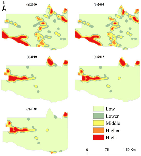 As illustrated in Figure 6, the high-value areas in the study area in 2000 and 2005 were found mainly in the central, northeastern, and southwestern forest and grassland areas, and the value of barren land’s ESs was also low. In 2010 and 2015, the area of primary forest and grassland in the central part of the study area was significantly reduced due to frequent coal mining activities. The LULC pattern of the study area changed, resulting in a shift from high-value areas to low-value areas. However, in the northern Beita Mountain and Huangju, this may be related to the surrounding protected areas and national parks. In 2020, as the intensity of human activities and mining in the study area increased, the area covered by forest and grassland decreased, and the value of ESs decreased. In 2020, the intensity of human activities in the Zhundong coalfield increased, mining increased, the area covered by forest and grassland decreased, and the ESV declined.