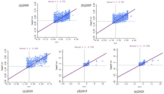 Utilizing the Geoda model’s exploratory spatial analysis function, we conducted a global spatial autocorrelation analysis. As depicted in Figure 7, Moran’s I value exceeded 0.7 in all years, signifying a pronounced positive spatial autocorrelation and a remarkable spatial clustering effect in the ES values within the Zhundong coalfield.