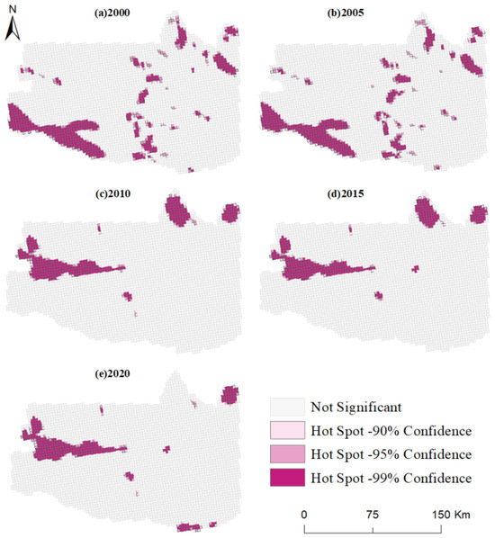 The hotspot detection results (Figure 8) show no coldspots in the Zhundong area, and the hotspot areas are mainly concentrated in the forest and grassland distribution areas, nature reserves, and the areas around water sources. Between 2000 and 2005, hotspot areas did not change significantly, and between 2010 and 2020, changes were consistent with the previous LULC distribution changes. The hotspot areas are areas with a high ESV. However, since most of the land in the Zhundong coalfield is unused, the hotspot areas are not significant.