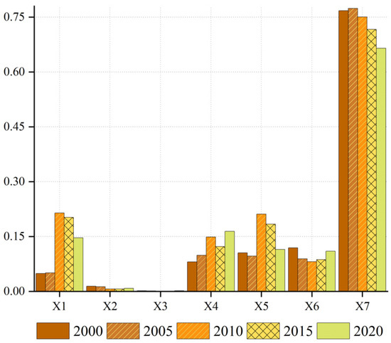 To effectively detect the drivers of ESV in the Zhundong area, seven factors were selected, as illustrated in Figure 9. These factors consist of DEM (X1), slope (X2), slope direction (X3), air temperature (X4), precipitation (X5), NDVI (X6), and LULC (X7). The aim of this selection is to accurately identify the drivers of ESV in the study region. In 2000–2020, the average q-values for each variable, from largest to the smallest, were LULC (0.7348) > precipitation (0.1426) > DEM (0.1328) > temperature (0.1231) > NDVI (0.0974) > slope (0.0099) > slope direction (0.0014), in order. LULC serves as the primary determinant of the ES value in the study area. Furthermore, precipitation plays a pivotal role in influencing the ES value. Additionally, variations in DEM impact the distribution of vegetation and the scope and intensity of human activities and ultimately shape the ecosystem’s structure and function by creating a locally heterogeneous environment [54].
