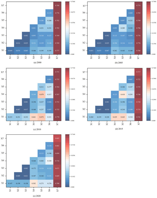 The interaction detection of the seven factors showed that the results were mainly bifactor enhanced and non-linearly enhanced in 2000–2020, which means that the explanatory power of the interaction of the seven factors was more potent than that of individual factors in different periods, indicating that the spatial and temporal variation of the ESV in the Zhundong coalfield was the result of the combined effect of multiple factors. As shown in Figure 10, the temperature ∩ LULC interaction produced the most significant effect in 2000, 2005, 2015, and 2020 (0.7821, 0.7962, 0.7456, and 0.7156, respectively), and the most significant interaction in 2010 was DEM ∩ LULC (0.7702).