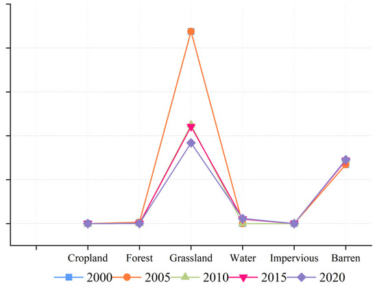 The change in ESV from 2000 to 2020 was consistent with the change in LULC. In terms of timescale, the total ESV of grassland was the highest during the study period, followed by barren areas (Figure 11); the findings by Liu Fang align with ours regarding ESs in the Zhundong area [50]. Grassland reached its highest value in 2000 and 2005 and its lowest value in 2020. As the intensity of human activities increased in 2006, the area of land for construction in the study area began to expand, the size of the water areas began to grow, and the cropland area around Jijihu maintained a stable and small increasing trend. However, the primary forest and grassland areas decreased significantly relative to 2000 and 2005. The rate of increase in the area of other land types was much lower than the rate of decrease in grassland, resulting in an increased area of barren land in the study area and total ESV in 2020. The highest ES value was observed in 2020.