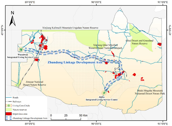 The government and relevant departments have been implementing the regional development strategy of the state and the autonomous region and the strategy of the main functional area and have actively taken a series of practical and effective measures to commit to ecological restoration and protection and build the core guiding principles of the overall spatial pattern of “one belt, two centers” (refer to Figure 12). This pattern closely relies on the natural geographical pattern, which not only highlights the regional characteristics but also embodies the concept of the deep integration of green development and ecological priority. Through careful planning and layout, the “one belt”, i.e., the Jundong Linkage Development Belt, will give full play to the advantages of the transport corridor, linking the two major comprehensive life service bases of Wucaiwan and Splendid Lake, as well as the major industrial development areas in the whole region, facilitating the harmonious coexistence of industry and ecology. As the core engine of industrial development and the important support of ecological protection, the “two centers” will further improve the quality of regional habitats through scientific and reasonable spatial layout, infrastructure construction, and resource recycling and create a more livable and workable living environment for people. The Zhundong region should adhere to green, low-carbon, and sustainable development, promote industrial optimization and adjustment, rationally utilize resources, and strengthen environmental protection. The government should implement eco-efficiency assessment, incorporate it into enterprise performance evaluation, and encourage green technology innovation and clean energy use. They should also limit the scale of production in mining areas, adopt energy-saving and environmentally friendly technologies, establish an ecological compensation mechanism, and try out economic compensation schemes. In addition, decision makers should improve the system of the paid use of resources, promote the capitalization and marketization of environmental resources, establish a deposit system for ecological environment restoration and management, strengthen the responsibility for ecological protection and restoration, and realize the rational allocation and efficient use of environmental resources. Through this series of efforts, the government will facilitate a win–win development of economic, social, and ecological benefits, lay a solid foundation for sustainable development in the region, contribute to the rational allocation and efficient use of environmental resources, provide a stable source of funding for ecological protection, and promote ecological environment protection and restoration.