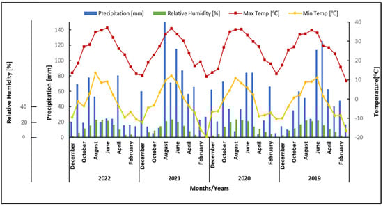 Precipitation, humidity and temperature data of the study area from 2019 to 2022 (www.fieldclimate.com, accessed on 1 March 2024).