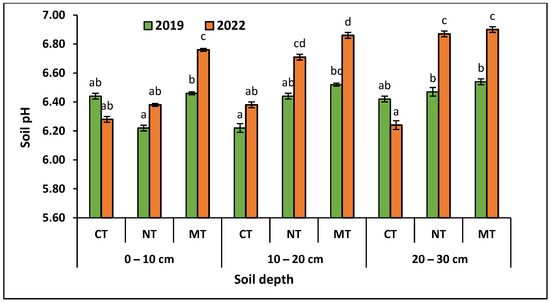 Variations and dynamics of soil pH at 0–30 cm depths under tillage and straw practices from 2019 to 2022. MT: minimum tillage; NT: no-tillage; CT: conventional tillage. Error bars represent the corresponding standard error of mean values. Different letters indicate significant differences between treatments during this period at the 0.05 level.