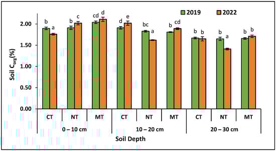 The main component of soil organic matter is organic carbon, which is a useful indicator of soil productivity and fertility [40]. According to this research, MT and NT significantly boosted the organic carbon content in the 0–10 cm soil layer by 20.5% and 13.1% as compared with CT (Figure 4). Exclusively MT raised the organic carbon approximately 7.4% towards 10–20 and 20–30 cm soil depth. In addition, MT increased the surface (0–10 cm) and sub-surface (10–30 cm) total organic carbon to 6.5% and 28.2%, respectively, relative to NT. Overall, the adoption of conservation tillage for three years (2019–2022) resulted in higher fertility of the surface soil with 0.12–0.17% compared with conventional tillage; minimum tillage with straw burying is advantageous for soil organic carbon improvement due to the straw area’s contact with soil enzymes and microorganisms, which provide organic matter/humus buildup.