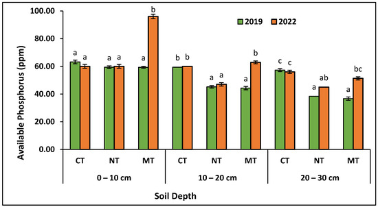 Phosphorus, an essential plant nutrient, is frequently required in consistent and regular quantities to ensure crop yield. According to Figure 5, the 0–30 cm soil available phosphorus content increased by 2% and 36%, respectively, under NT and MT compared with CT. In addition, mainly MT increased the surface 0–10 cm depth available P content by 32% while conventional tillage depicted a constant trend in 0–30 cm soil profile by 54 ppm. This constant trend could be explained by the mineralization and breakdown of soil organic matter induced by tillage practice which changes the variety and activity of soil enzymes and microbial community and influences the quantity and stoichiometry of soil phosphorus [61]. Under CT, the buffer plant available P capacity is decreased, as these fractions are wasted greater relative to overall P content [62]. The reduced C content in the plow layer of this tillage system and the phosphate ions exhibition towards new soil adsorption sites are responsible for phosphate interactions (to positive surface charges from Fe and Al), decreasing its accessibility and strength of desorption [63,64].